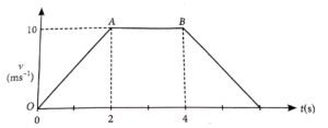 12. The velocity-time graph of an object moving along straight line is shown in figure. What is the distance covered by the object between t =0 to t = 4s.