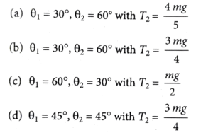 1. A body of mass m is suspended by two strings making angles θ_1 and θ_2 with the horizontal ceiling with tensions T₁ and T₂ simultaneously. T₁ and T₂ are related by T_1 = √3 T_2, the angles θ_1  and θ_2