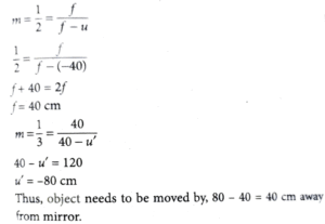 6. When an object is placed 40 cm away from a spherical mirror an image of magnification 1/2 is produced. To obtain an image with magnification of 1/3 the object is to be moved