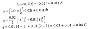 11. Current passing through a wire as function of time is given as I(t) = 0.02t + 0.01A. The charge that will flow through the wire from t = 1 s tot t = 2 s is
