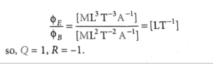 14. In an electromagnetic system, the quantity representing the ratio of electric flux and magnetic flux has dimension of M^P  L^Q  T^R  A^S, where value of 'Q' and 'R' are