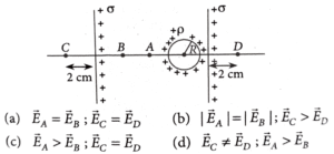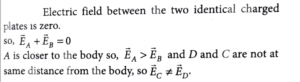 16. Two infinite identical charged sheets and a charged spherical body of charge density 'ρ' are arranged as shown in figure. Then the correct relation between the electrical fields at A, B, C and D points is