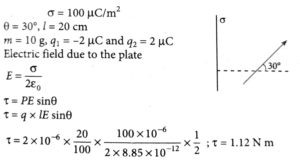 18. Two small spherical balls of mass 10 g each with charges -2 µC and 2 µC, are attached to two ends of very light rigid rod of length 20 cm. The arrangement is now placed near an infinite non-conducting charge sheet with uniform charge density of 100 µC/m² such that length of rod makes an angle of 30° with electric field generated by charge sheet. Net torque acting on the rod is