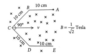 23. Conductor wire ABCDE with each arm 10 cm in length is placed in magnetic field of 1/√2 Tesla, perpendicular to its plane. When conductor is pulled towards right with constant velocity of 10 cm/s, induced emf between points A and E is ________ mV.
