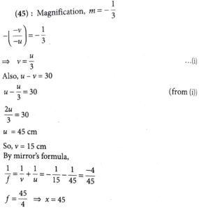 24. Distance between object and its image (magnified by - 1/3 ) is 30 cm. The focal length of the mirror used is (x/4) cm, where magnitude of value of x is ____________.