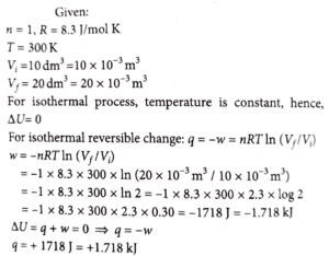 1. One mole of an ideal gas expands isothermally and reversibly from 10 dm³ to 20 dm³ at 300 K. ΔU, q and work done in the process respectively are