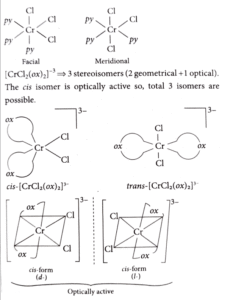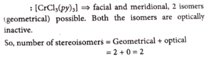 3. Number of stereoisomers possible for the complexes, [CrCl_3 (py)_3] and [CrCl_2 (ox)_2 ]^3-  are respectively (py = pyridine, ox = oxalate)