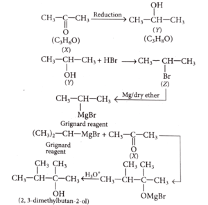 6. An organic compound (X) with molecular formula C_3 H_6 O is not readily oxidised. On reduction it gives C_3 H_8 O (Y) which reacts with HBr to give a bromide (Z) which is converted to Grignard reagent. This Grignard reagent on reaction with (X) followed by hydrolysis give 2, 3-dimethylbutan-2-ol. Compounds (X), (Y) and (Z) respectively are