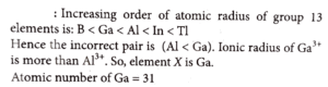 (B < Al), (Al < Ga) < (Ga < In) and (In < Tl) Identify the elements present in the incorrect pair and in that pair find out the element (X) that has higher ionic radius ( M^3+) than the other one. The atomic number of the element (X) is.
