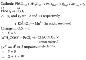 21. KMnO_4 acts as an oxidising agent in acidic medium. 'X' is the difference between the oxidation states of Mn in reactant and product. 'Y' is the number of 'd' electrons present in the brown red precipitate formed at the end of the acetate ion test with neutral ferric chloride. The value of X + Y is.
