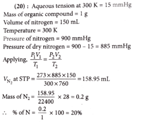 22. In Dumas' method for estimation of nitrogen 1 g of an organic compound gave 150 mL of nitrogen collected at 300 K temperature and 900 mmHg pressure. The percentage composition of nitrogen, in the compound is____________ % (nearest integer).