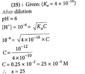 24. The pH of a 0.01 M weak acid HX (K_a = 4 × 10-¹º) is found to be 5. Now the acid solution is diluted with excess of water so that the pH of the solution changes to 6. The new concentration of the diluted weak acid is  given as x × 10^-4 M. The value of x is___________.(nearest integer)