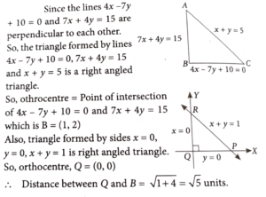 14. Let the three sides of a triangle are on the lines 4x - 7y + 10 = 0, x + y = 5 and 7x + 4y = 15. Then the distance of its orthocentre from the orthocentre of the triangle formed by the lines x = 0, y = 0 and x + y = 1 is