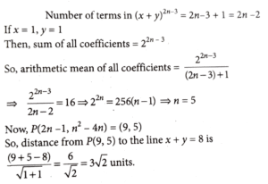 19. For an integer n ≥ 2, if the arithmetic mean of all coefficients in the binomial expansion of (x + y)^2n - 3 is 16, then the distance of the point P (2n - 1,n²- 4n) from the line x + y = 8 is