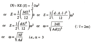 12. A thin uniform of length 2 m, cross sectional area ‘A’ and density ‘d’ is rotated about an axis passing through the centre and perpendicular to its length with angular velocity ω. If value of ω in terms of its rotational kinetic energy E is √αE / Ad  then value of α is ______________________.