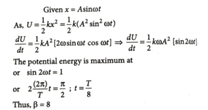 14. The general displacement of a simple harmonic oscillator is x = A sin ωt. Let T be its time period. The slope of its fits potential energy (U) – time (t) curve will be maximum when t = T/β. The value of β is ___________________