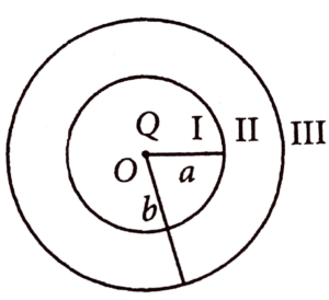 19. As shown in the figure, a point charge Q is placed at the centre of conducting spherical shell of inner radius a and outer radius b. The electric field due to charge Q in three different regions I, II and III is given by (I : r < a, II : a < r < b, III: r > b)