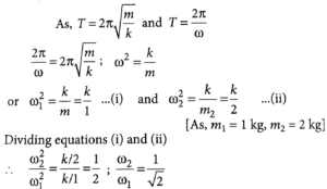 21. For a simple harmonic motion in a mass spring system shown, the surface is frictionless. When the mass of the block is 1 kg, the angular frequency is ω₁. When the mass block is 2 kg the angular frequency is ω2. The ratio ω21 is