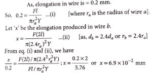 22. A force is applied to a steel wire ‘A, rigidly clamped at one end. As a result elongation in the wire is 0.2 mm. If same force is applied to another steel wire ‘B’ of double the length and a diameter 2.4 times that of the wire ‘A’, the elongation in the wire ‘B’ will be (wires having uniform circular cross sections)