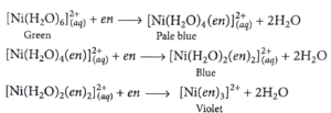 8. When ethane-1, 2-diamine is added progressively to an aqueous solution of Nickel(II) chloride, the sequence of colour change observed will be