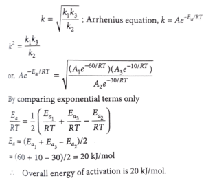 21. Consider a complex reaction taking place in three steps with rate constants k_₁, k_2 and k_3 respectively. The overall rate constant k is given by the expression k = √k_1 k_3/k_2. If the activation energies of the three steps are 60, 30 and 10 kJ mol-¹ respectively, then the overall energy of activation in kJ mol-¹ is ________(Nearest integer)