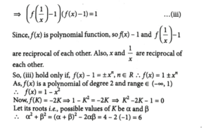 7. Let f: R- {0} → (-∞, 1) be a polynomial of degree 2,  satisfying f(x) f ( 1/x ) = f(x)+f (1/x). If f(K) = - 2K, then the sum of squares of all possible values of K is:
