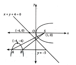 22. Let A and B be the two points of intersection of the line y + 5 = 0 and the mirror image of the parabola     y² = 4x with respect to the line x + y + 4 = 0. If d denotes the distance between A and B, and a denotes the area of ΔSAB, where S is the focus of the parabola y² = 4x, then the value of (a + d) is_________.